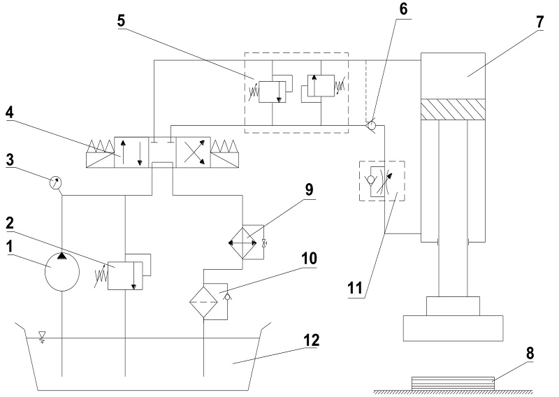7 - Xi lanh thủy lực 8 - Vật liệu ép 9 - Cụm làm mát 10 - Cụm lọc dầu 11- Van tiết lưu một chiều 12 - Bể dầu |