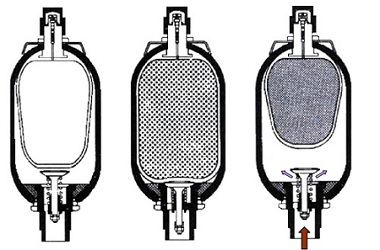 Đối với bình tích năng thủy khí có ngăn chia đàn hồi nên sự dụng khí nitơ, nếu dùng không khí sẽ làm cao su mau hỏng.