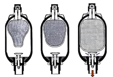 Thật không may, các máy bơm bù áp không phản ứng với sự thay đổi áp suất đủ nhanh, do đó dầu chảy ra từ bộ tích áp khi bắt đầu mọi chuyển động. Trong khi dầu đến từ bình tích, thể tích dầu giảm và thể tích khí tăng, do đó làm giảm áp suất cho đến khi bơm bắt kịp nhu cầu.