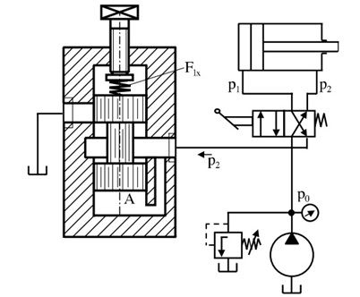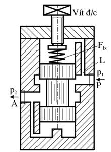 Trong ví dụ van cản được lắp ở cửa ra của xi lanh thủy lực có áp suất p2. Nếu lực lò xo của van là Flx và tiết diện của piston trong van là A, thì lực cân bằng tĩnh là: