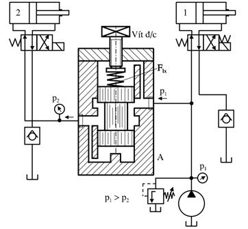 Trong hệ thống này, xi lanh 1 làm việc với áp suất p1, xi lanh 2 làm việc với áp suất p2 < p1. Nhờ có van giảm áp mà áp suất p2 có thể điều chỉnh được.