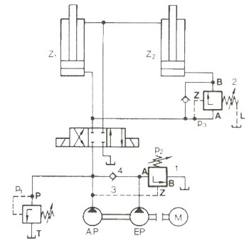 Nhiệm vụ của van đóng, mở nối tiếp như trên hình 5.13. Van mở được thực hiện trong trường hợp khi dòng chất lỏng qua van đảo chiều để thực hiện chuyển động làm việc, khi này bơm EP (có lưu lượng lớn dùng khi thực hiện chạy dao nhanh) qua van mở 1 cho dầu trở về thùng chứa để giảm tải cho động cơ điện. Van đóng thực hiện cho xi lanh Z2 trong trường hợp khi áp suất trong xi lanh Z1 đã đạt giá đặt p3. Như vậy van đóng mở nối tiếp có thể ứng dụng trong bơm thủy lực kép (khi một bơm làm việc áp suất lớn và khi cần lưu lượng lớn) hoặc cho cơ cấu 2 xi lanh chạy nối tiếp nhau.