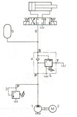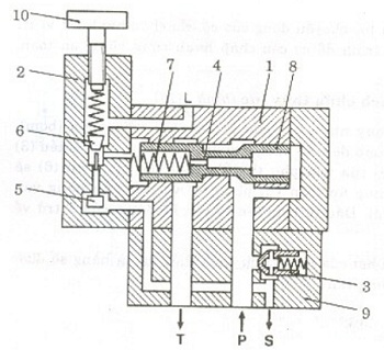 Nguyên lý làm việc của van này như sau: Cửa P được nối với nguồn thủy lực. Khi bình tích năng thủy lực được nạp đến áp suất quy định qua van một chiều 3 của cửa S, nó sẽ đẩy nòng van 5 của van phụ trợ 2, làm cho mặt côn 6 sẽ dịch chuyển lên trên. Xuất hiện chênh áp trên vòi phun 4 và như vậy nòng van chính 8 sẽ dịch chuyển về bên trái. Dầu từ bơm lên từ cửa P sẽ qua cửa T và trở về bể dầu.