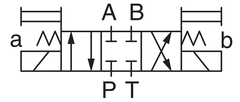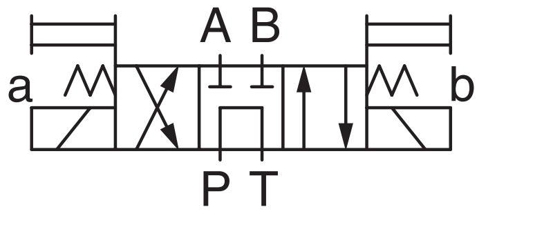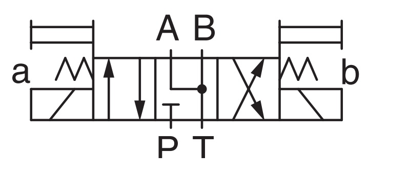 Nhìn vào sơ đồ mạch thủy lực ta có thể thấy, ở vị trí trung gian các đường dầu A,B,P,T không thông nhau điều đó có nghĩa là van này không có chức năng xả tải, đường A và B được chặn dầu. Tuy nhiên để chặn dầu kín hoàn toàn thì van này không đáp ứng được, đây là loại van sử dụng chủ yếu cho các ứng dụng đẩy xi lanh nằm ngang không cần giữ áp trong thời gian dài.